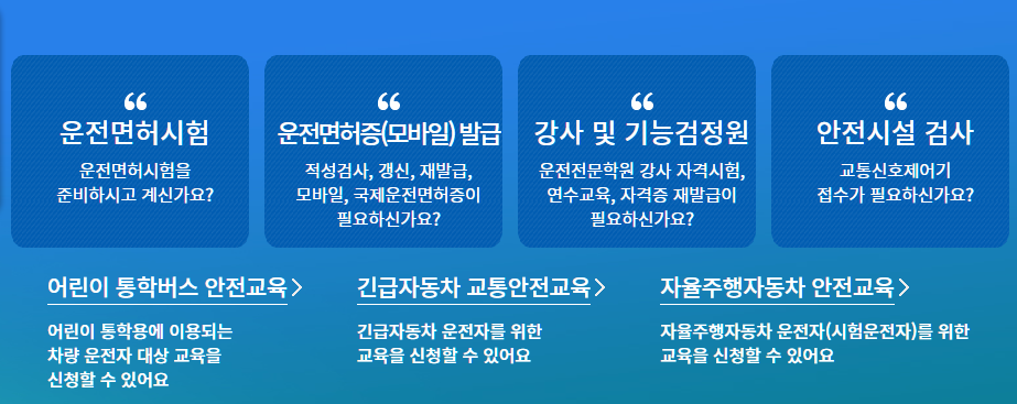 한국도로교통공단 공단소식, 사업안내,민원신고, 지방조직찾기 등정보제공 바로가기 안전운전 통합민원 운전면허 시험 및 발급 접수,교통안전교육 예약,교통안전시설 검사 접수 바로가기 교통